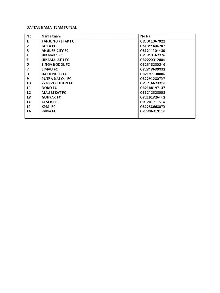 Banyak klub di dunia yang memiliki nama keren, dan kami memiliki stok nama yang bisa anda gunakan untuk tim futsal atau tim fantasy football . Futsal day, senarai pemain yang melengkapkan perpindahan bulan 7. Ipc fc pelindo ii · 6. Vamos mataram fc · 5.